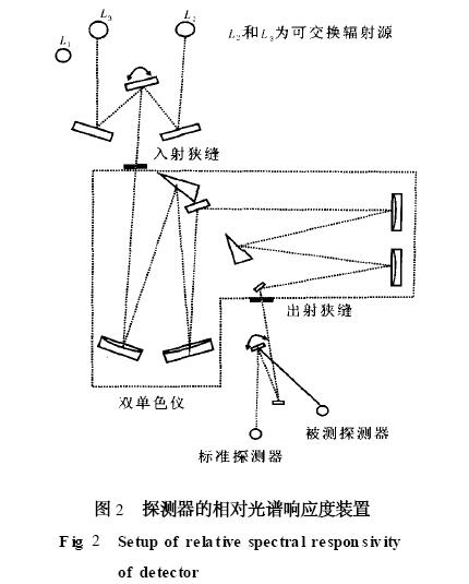 相對光譜響應度測量用的傳遞標準是非選擇性的腔形熱電堆, 為了保持它的非選擇性, 熱電堆必須在窗口外操作。但由于沒有窗口, 探測器隨外界空氣波動很靈敏, 它將產(chǎn)生一個毫瓦級的等效噪聲功率。為了準確測量, 必須提供幾十毫瓦的輻射功率, 該輻射功率對雙單色儀來說是不能接受的。如果使用單個單色儀, 則將會產(chǎn)生大量的雜散輻射, 但不會影響測量準確度, 因為被校準的熱電堆與腔探測器一樣無選擇性。